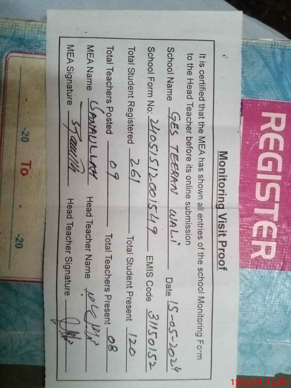 | Attendance Register | Head Teacher | MEA with School | Visit Proof |