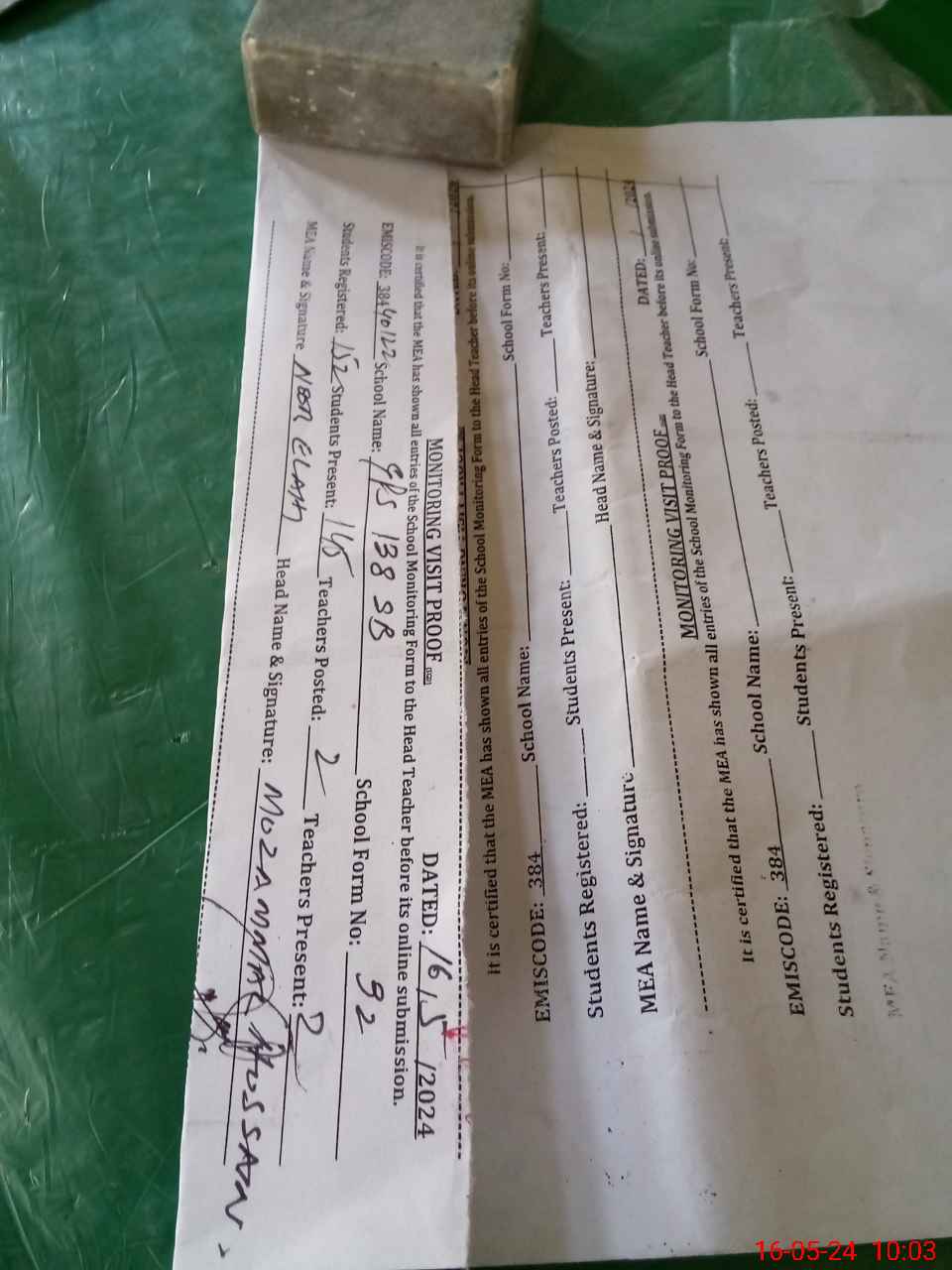 | Attendance Register | Head Teacher | MEA with School | Visit Proof |