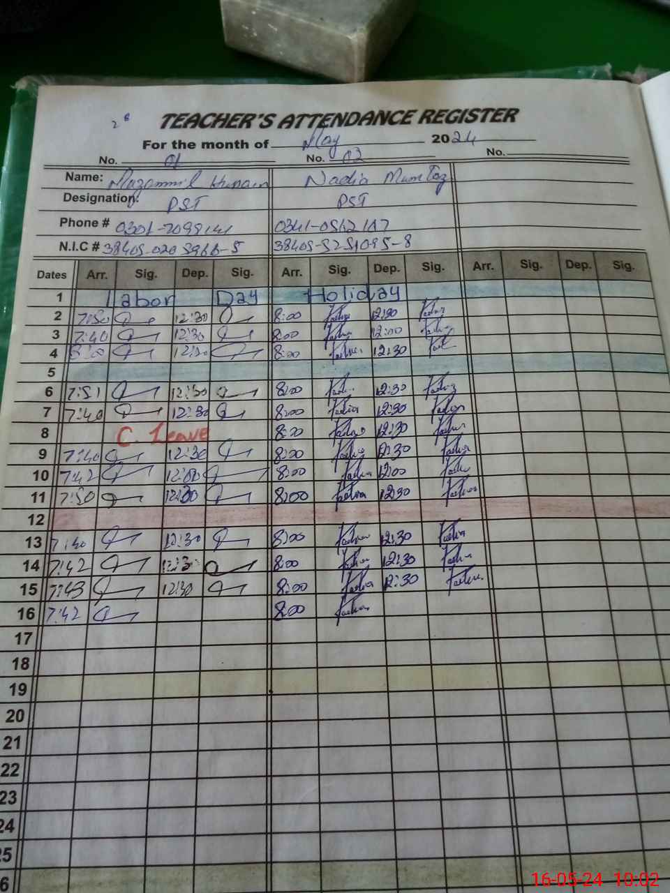 | CNIC | Full Name | Designation | R/C | Absence During Last Calender Month |