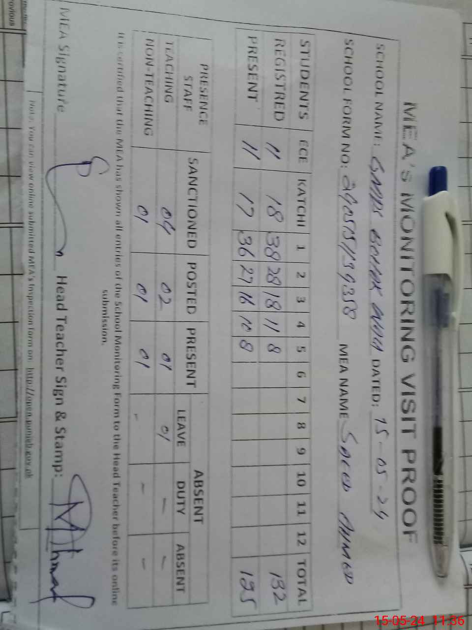 | Attendance Register | Head Teacher | MEA with School | Visit Proof |