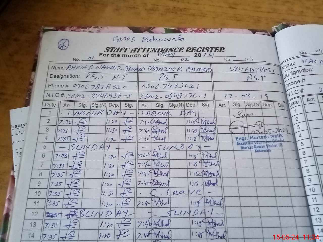 | CNIC | Full Name | Designation | R/C | Absence During Last Calender Month |