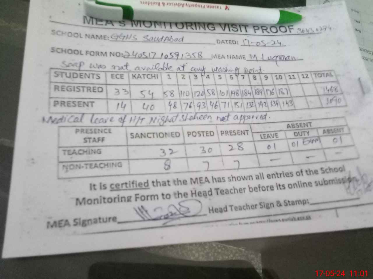 | Attendance Register | Head Teacher | MEA with School | Visit Proof |