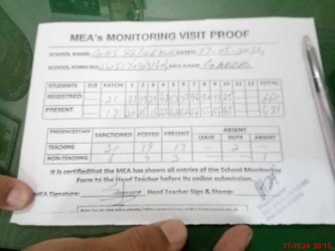 | Attendance Register | Head Teacher | MEA with School | Visit Proof |