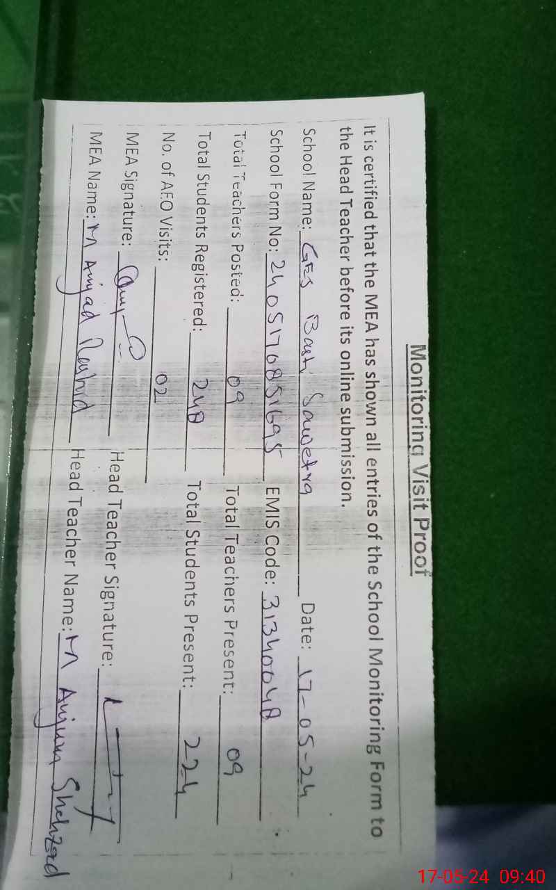 | Attendance Register | Head Teacher | MEA with School | Visit Proof |