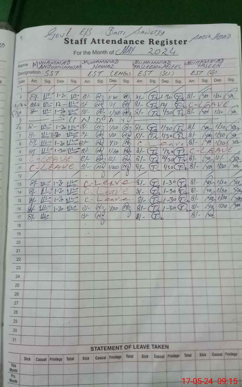 | CNIC | Full Name | Designation | R/C | Absence During Last Calender Month |