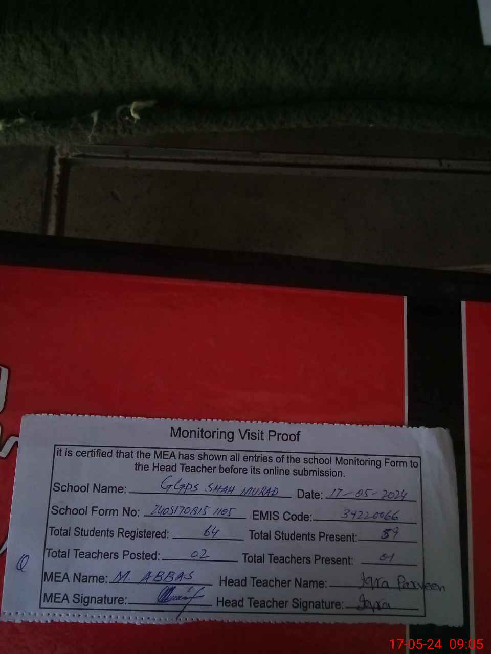 | Attendance Register | Head Teacher | MEA with School | Visit Proof |