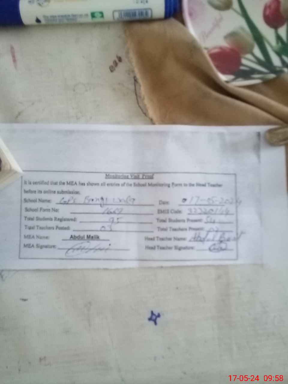 | Attendance Register | Head Teacher | MEA with School | Visit Proof |