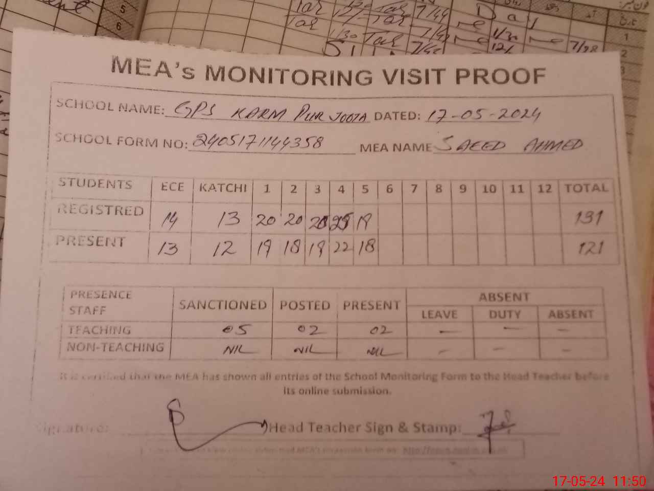 | Attendance Register | Head Teacher | MEA with School | Visit Proof |