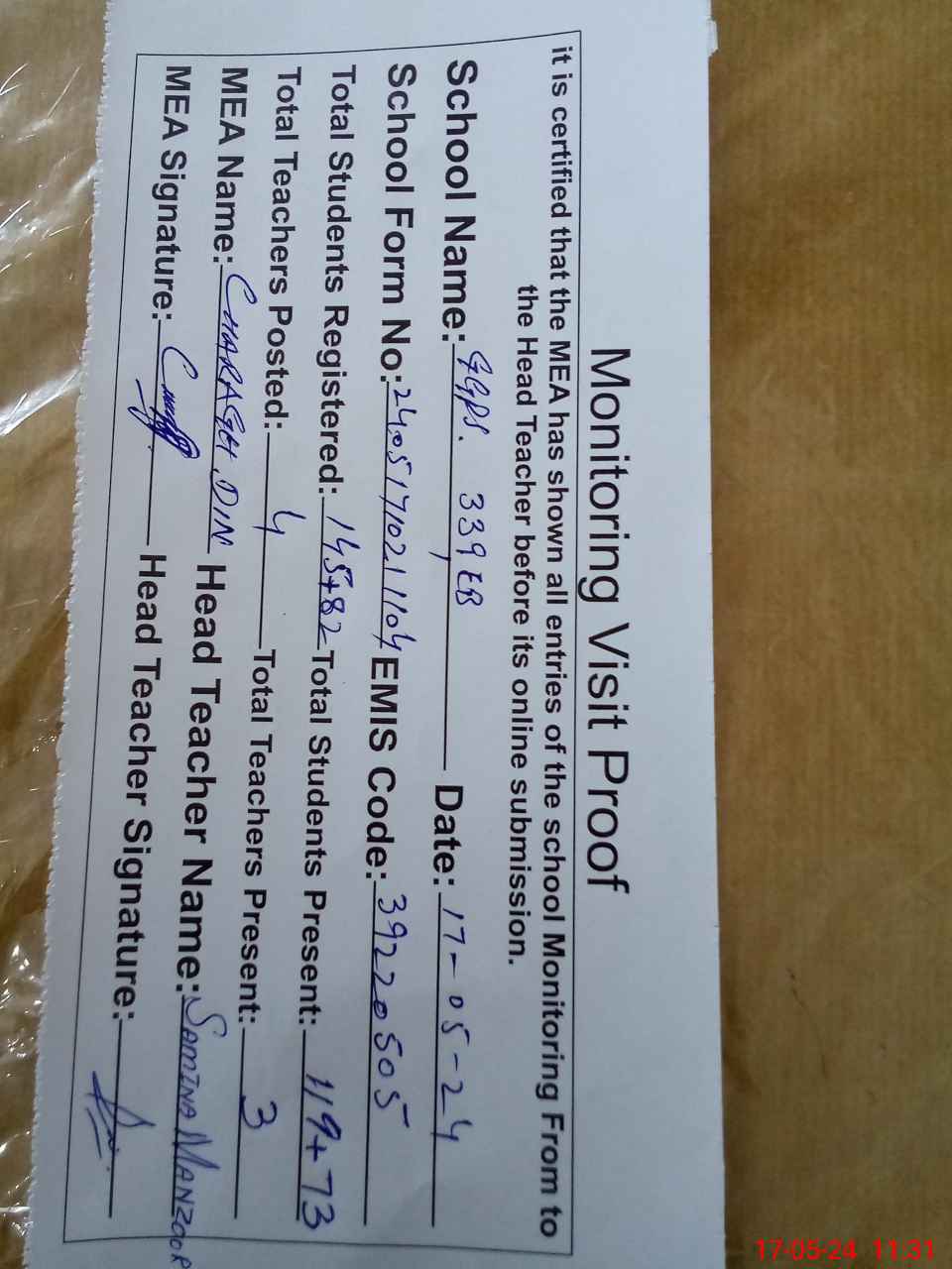 | Attendance Register | Head Teacher | MEA with School | Visit Proof |