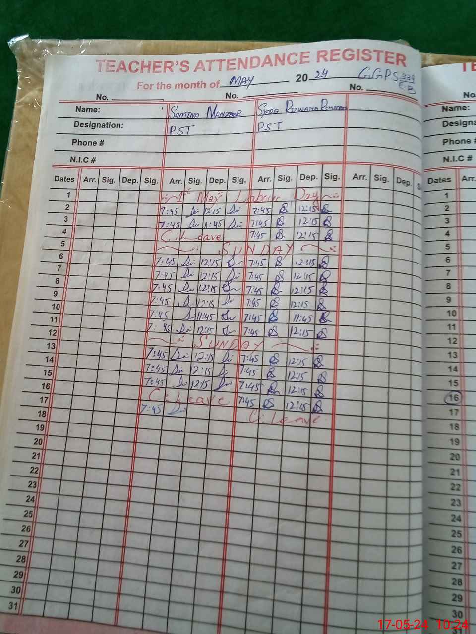 | CNIC | Full Name | Designation | R/C | Absence During Last Calender Month |