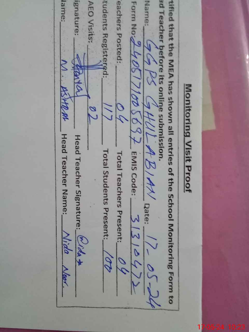 | Attendance Register | Head Teacher | MEA with School | Visit Proof |