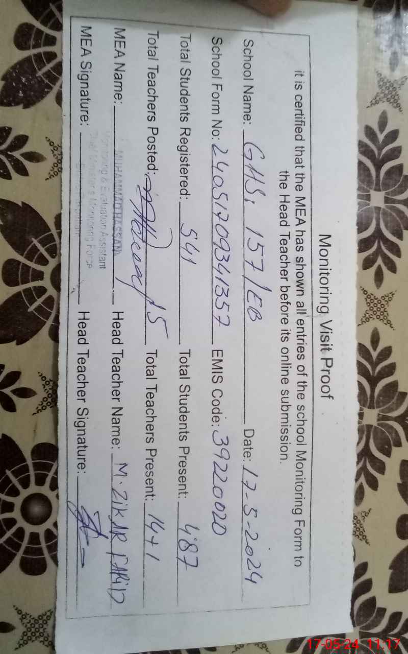| EMIS Code: 39220020 | Name of School: GHS 157/EB | |||