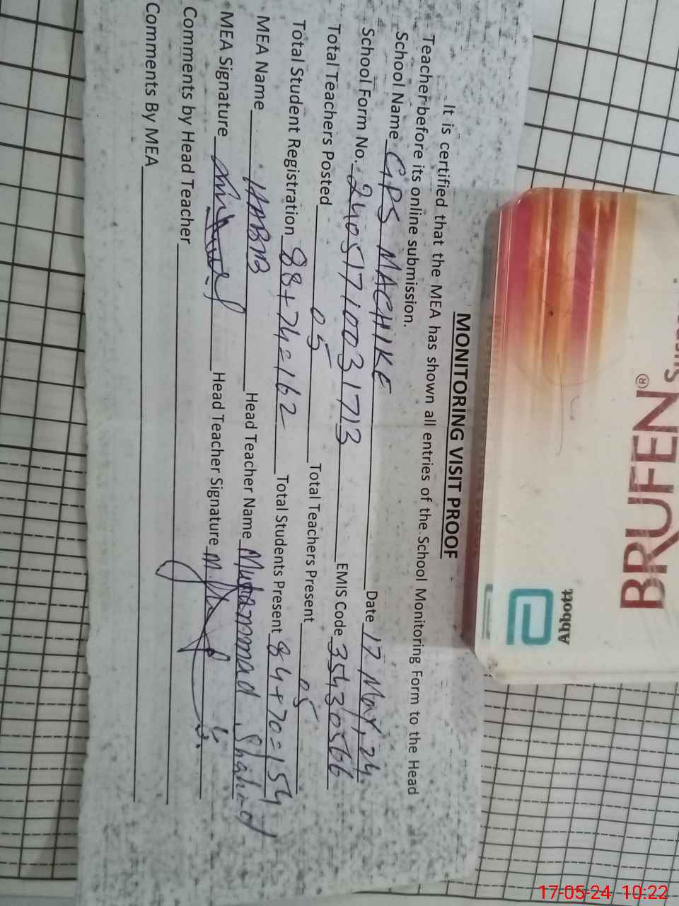 | Attendance Register | Head Teacher | MEA with School | Visit Proof |