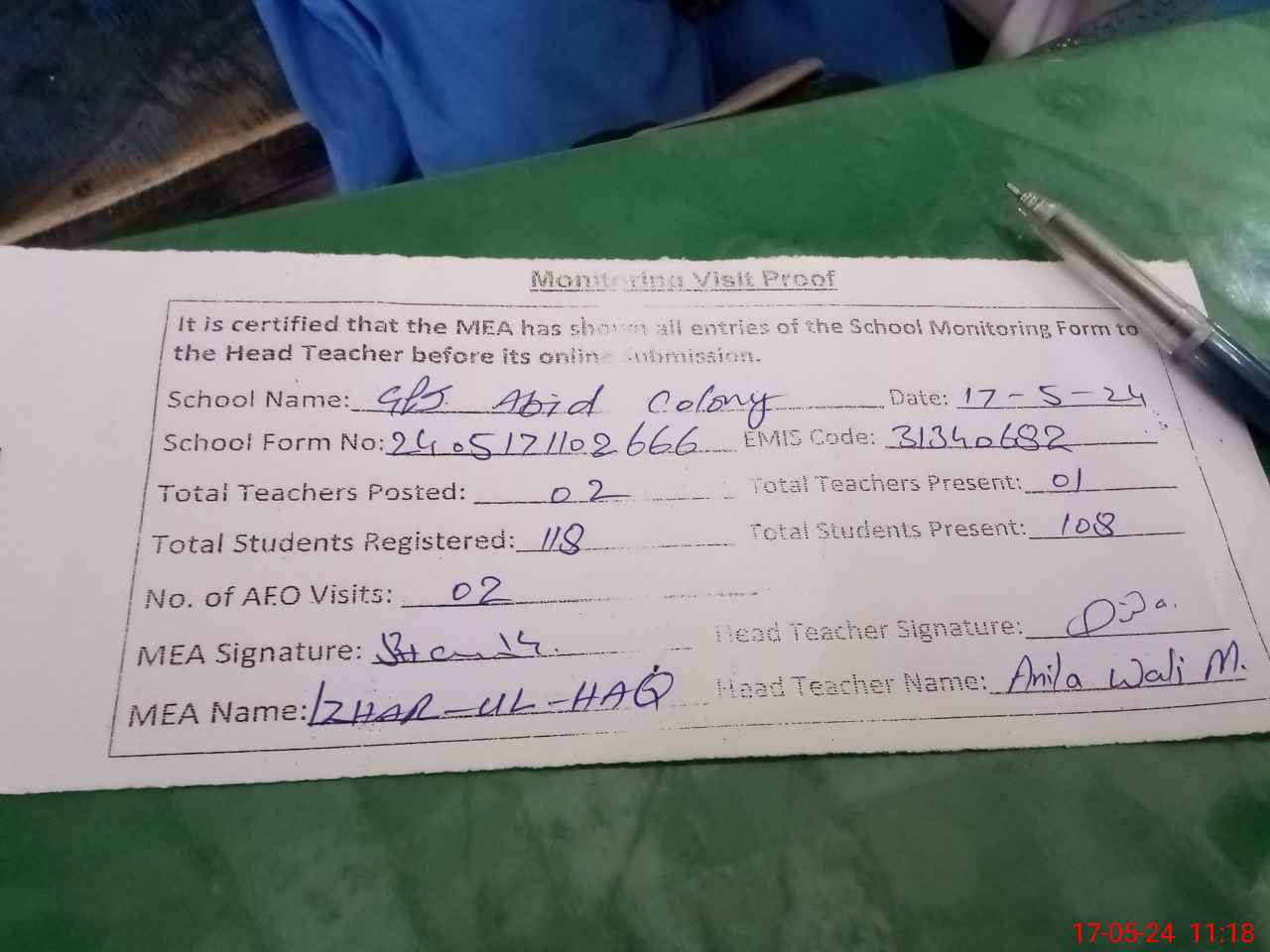 | Attendance Register | Head Teacher | MEA with School | Visit Proof |