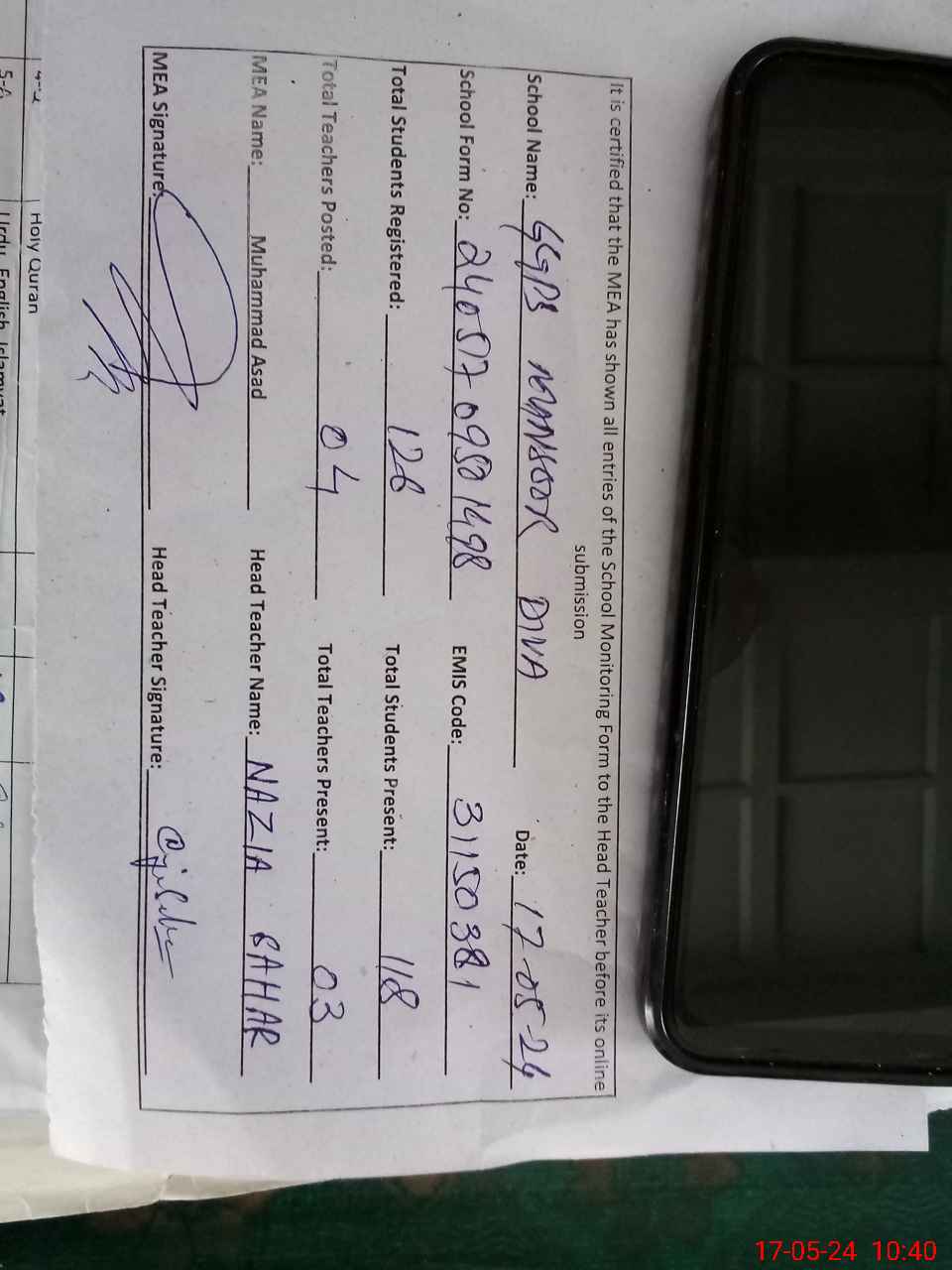 | Attendance Register | Head Teacher | MEA with School | Visit Proof |