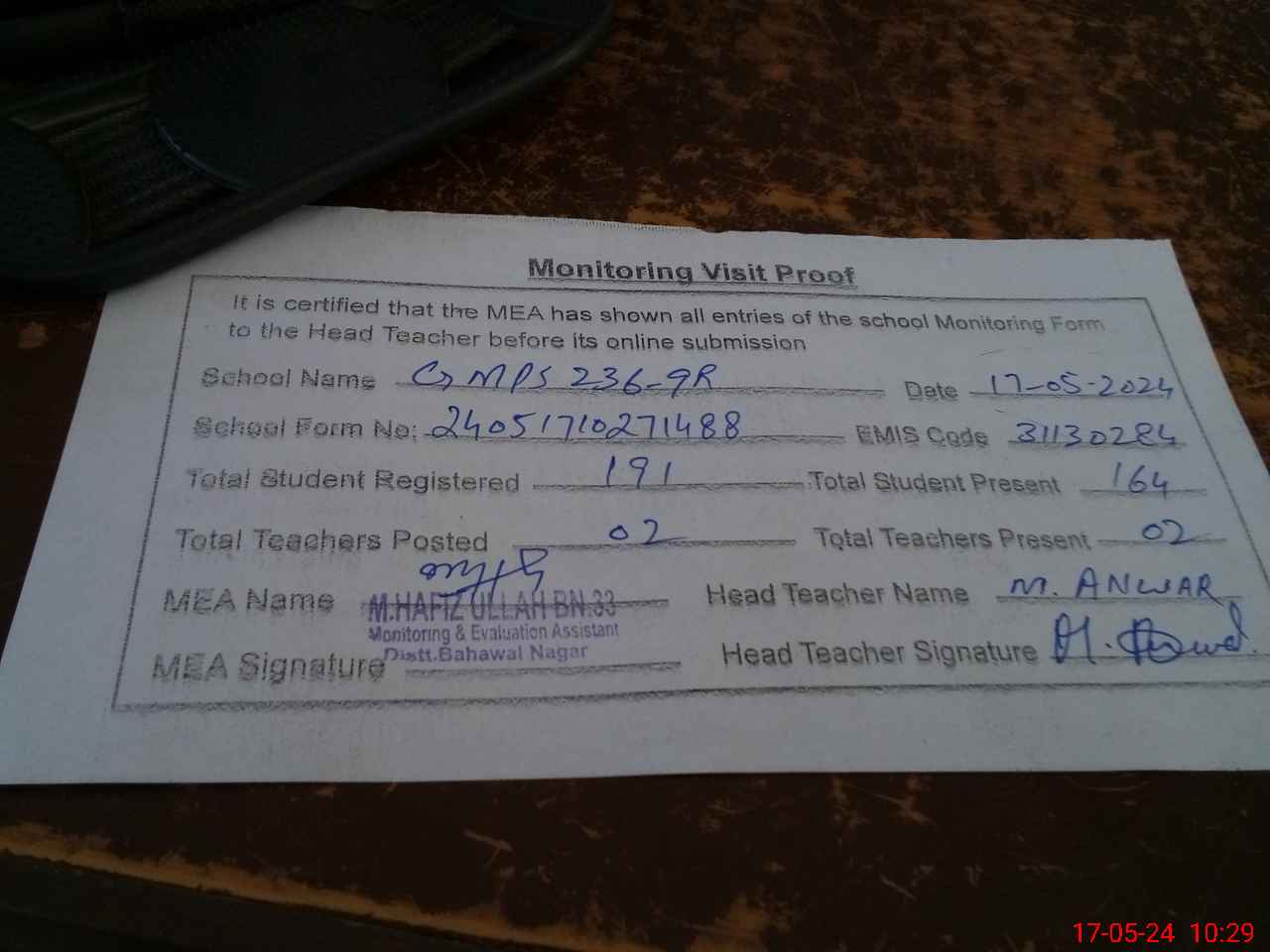 | EMIS Code: 31130284 | Name of School: GMPS CHAK NO. 236/9-R | |||