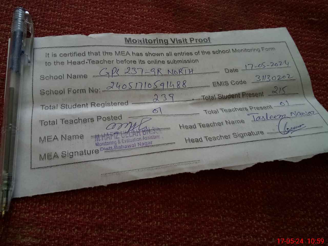 | Attendance Register | Head Teacher | MEA with School | Visit Proof |