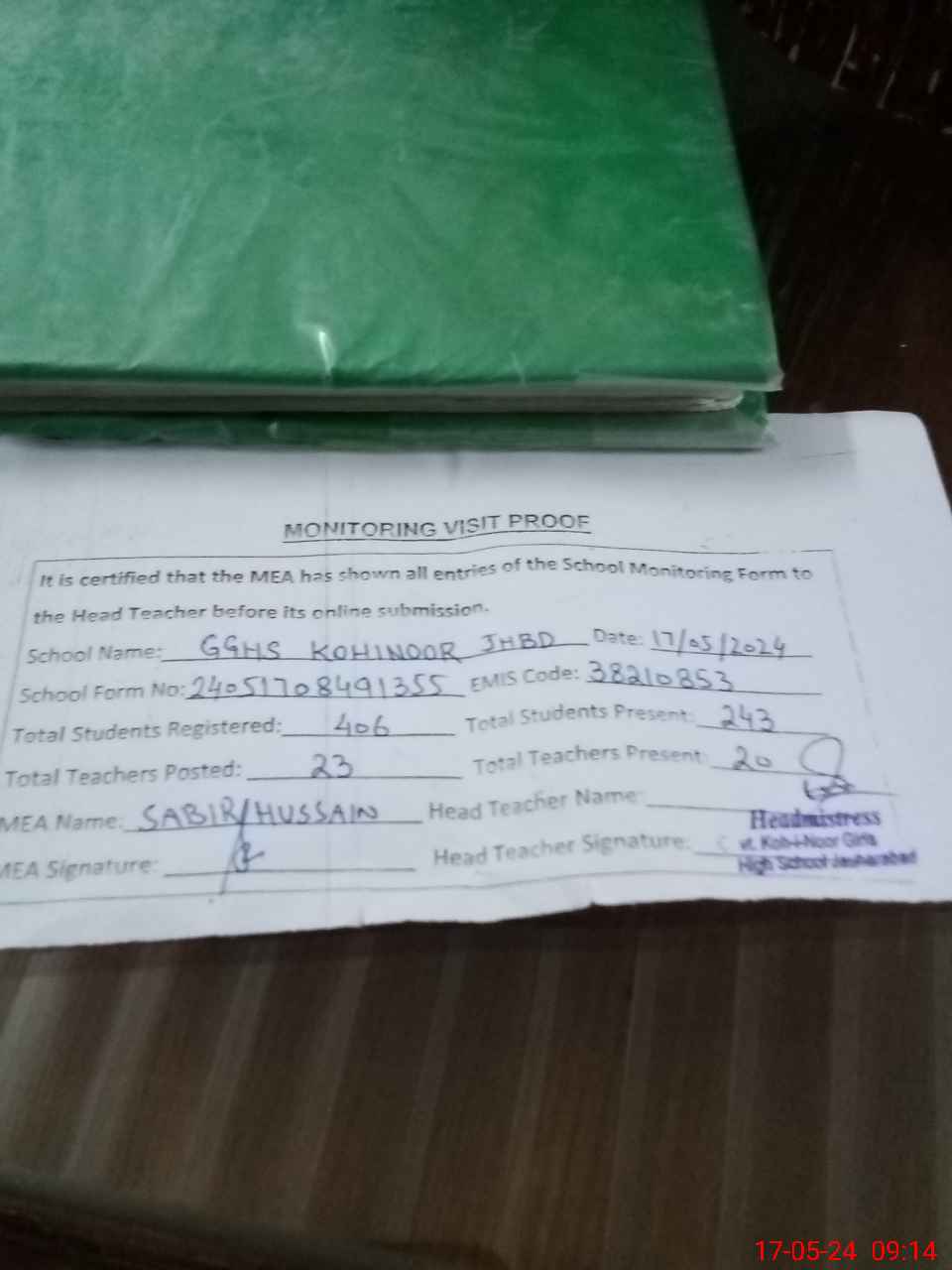 | Attendance Register | Head Teacher | MEA with School | Visit Proof |