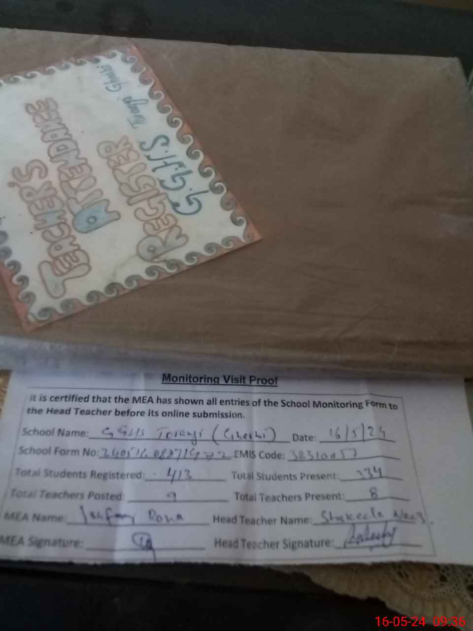 | Attendance Register | Head Teacher | MEA with School | Visit Proof |