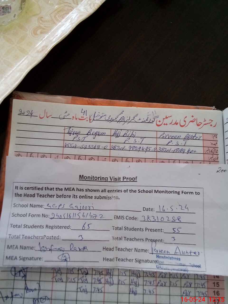 | Attendance Register | Head Teacher | MEA with School | Visit Proof |