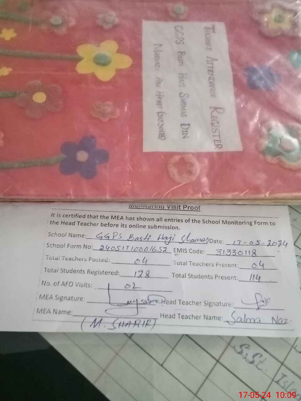 | Attendance Register | Head Teacher | MEA with School | Visit Proof |