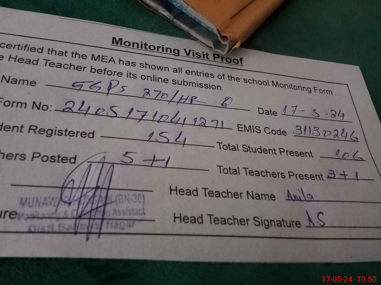 | Attendance Register | Head Teacher | MEA with School | Visit Proof |