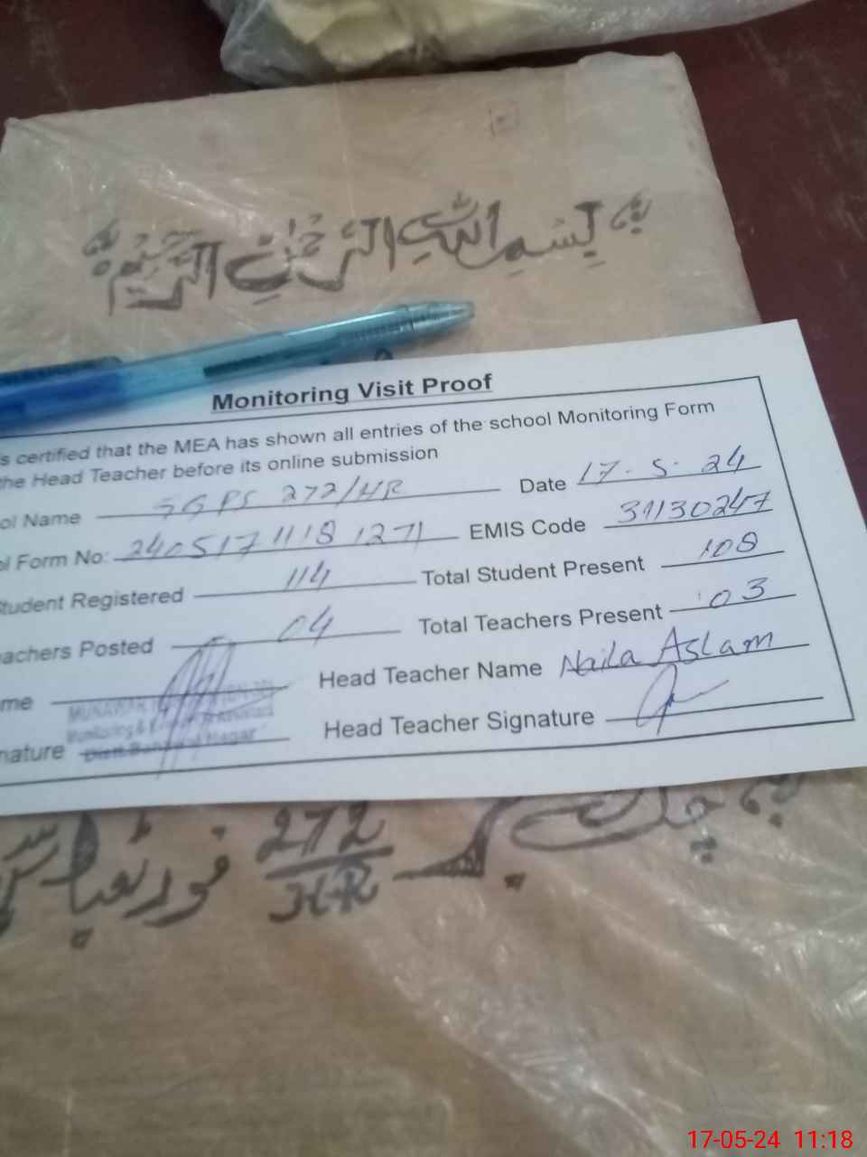 | EMIS Code: 31130247 | Name of School: GGPS CHAK NO 272 HR | |||