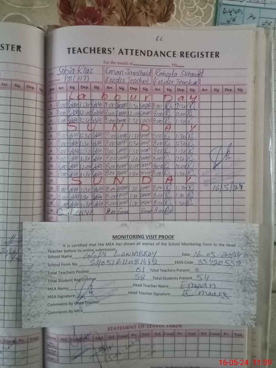 | Attendance Register | Head Teacher | MEA with School | Visit Proof |