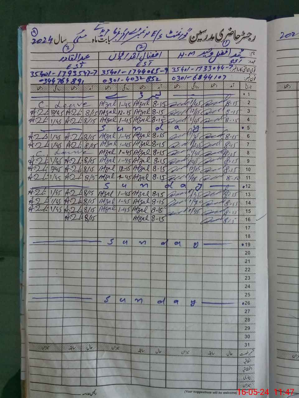 | CNIC | Full Name | Designation | R/C | Absence During Last Calender Month |