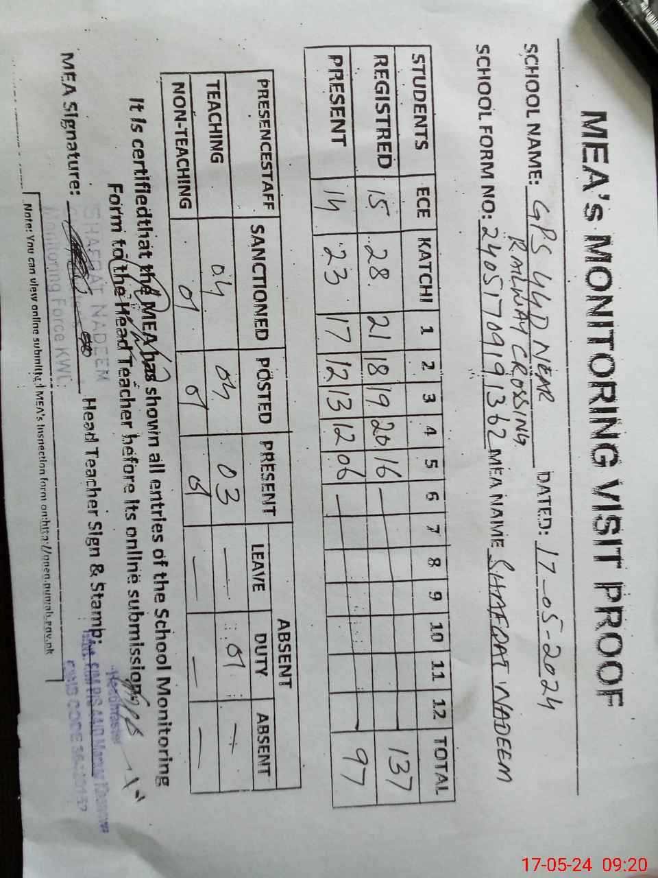 | Attendance Register | Head Teacher | MEA with School | Visit Proof |