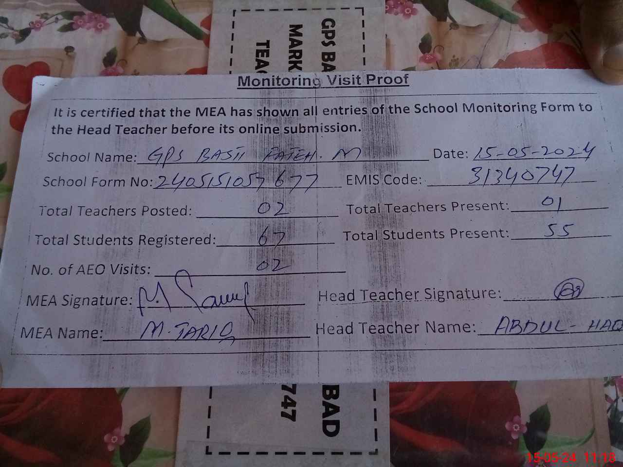 | Attendance Register | Head Teacher | MEA with School | Visit Proof |
