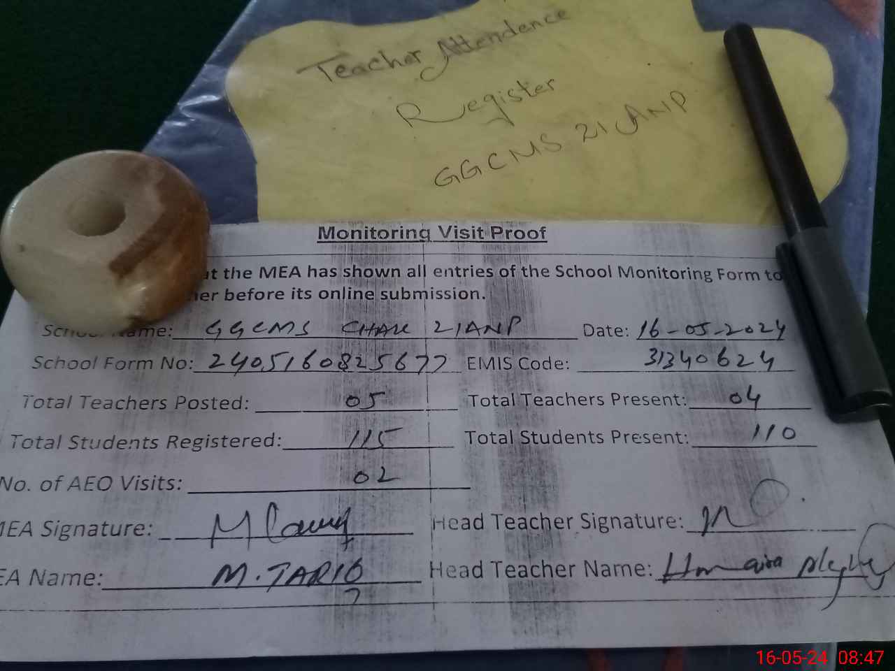 | Attendance Register | Head Teacher | MEA with School | Visit Proof |