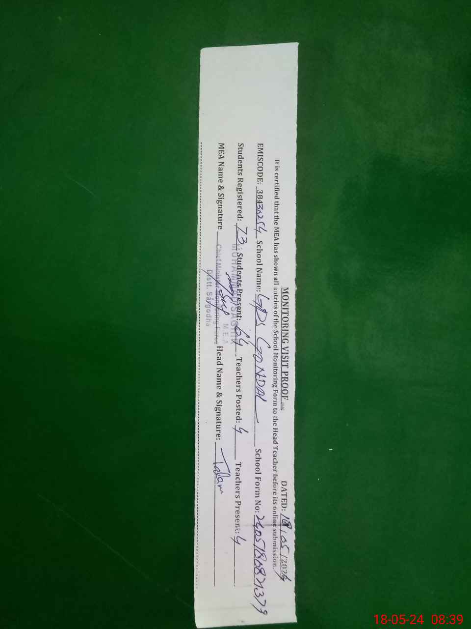 | Certified that this School was Inspected by the Undersigned MEA/DMO Today and the Information Stated Above is as Per Record. | |||||