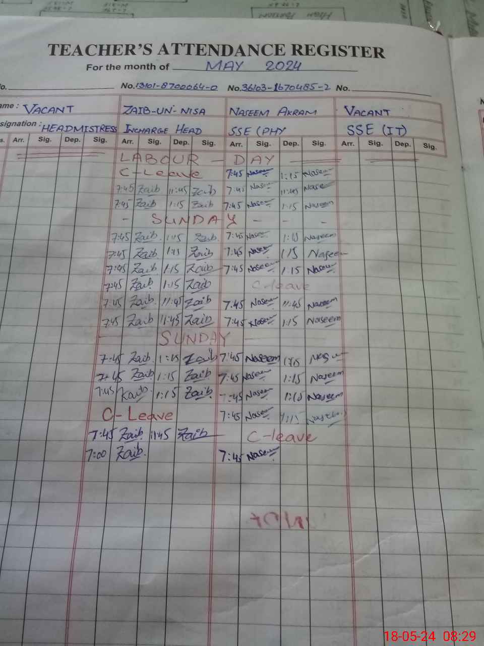 | CNIC | Full Name | Designation | R/C | Absence During Last Calender Month |
