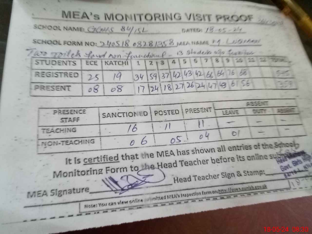 | Attendance Register | Head Teacher | MEA with School | Visit Proof |