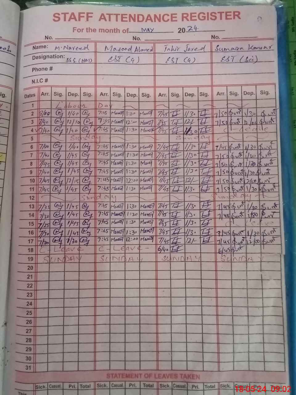 | CNIC | Full Name | Designation | R/C | Absence During Last Calender Month |