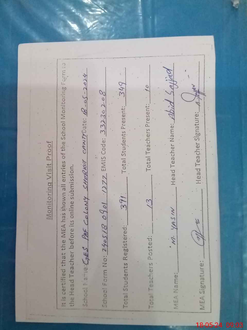 | Attendance Register | Head Teacher | MEA with School | Visit Proof |