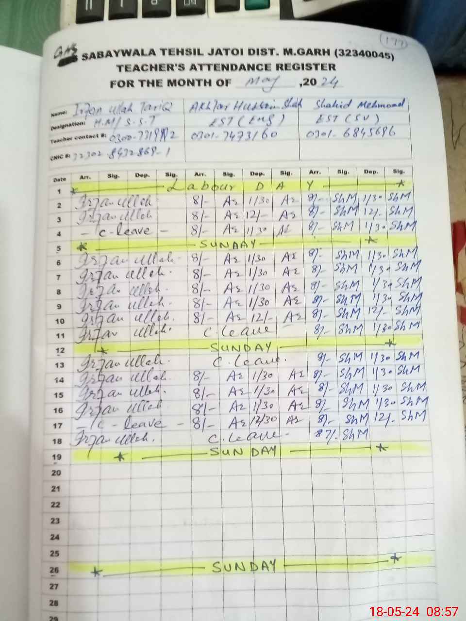| Name: IR**** UL**** TA**** Designation: (School Headmaster's/Headmistress's) S.S.T.(GEN) Phone/Cell Number: 03**** |