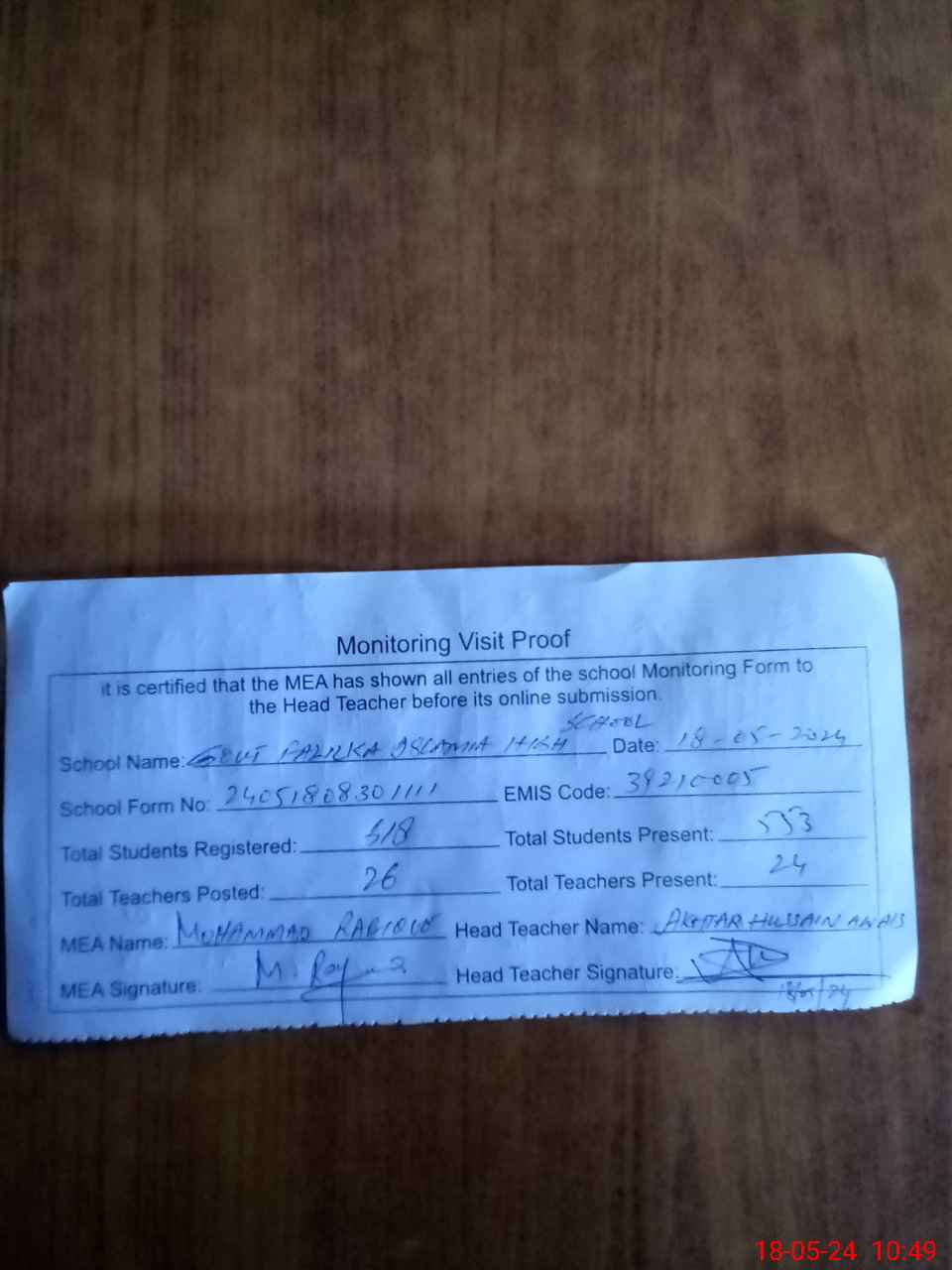 | Certified that this School was Inspected by the Undersigned MEA/DMO Today and the Information Stated Above is as Per Record. | |||||
