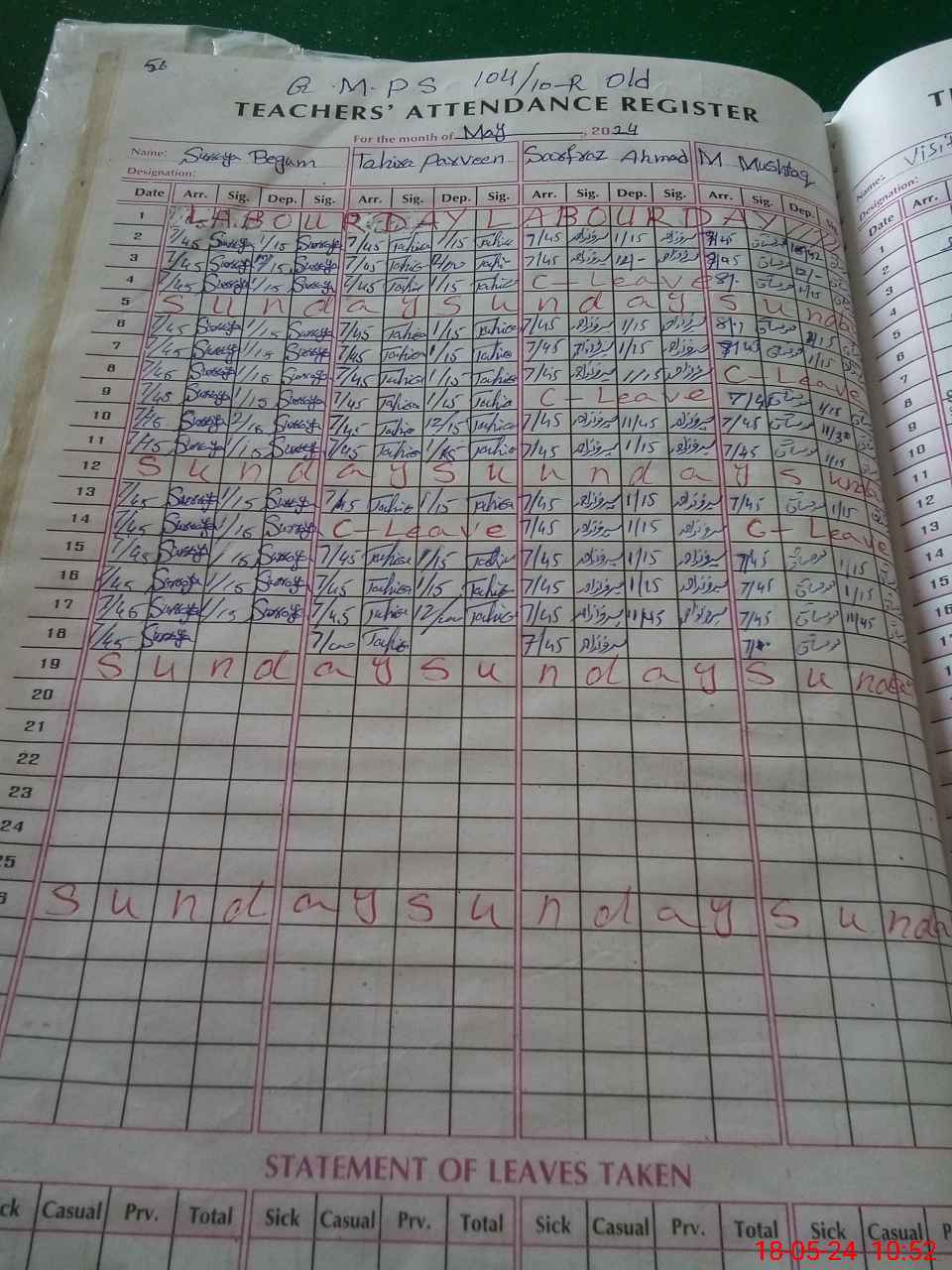 | Leave | Duty | Absent | Maternity | Medical | Ex- Pak |