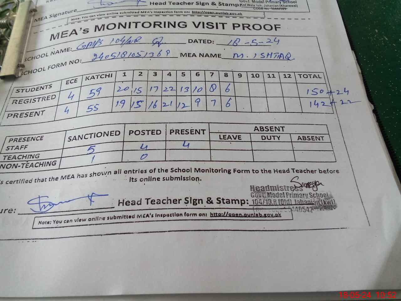 | Attendance Register | Head Teacher | MEA with School | Visit Proof |
