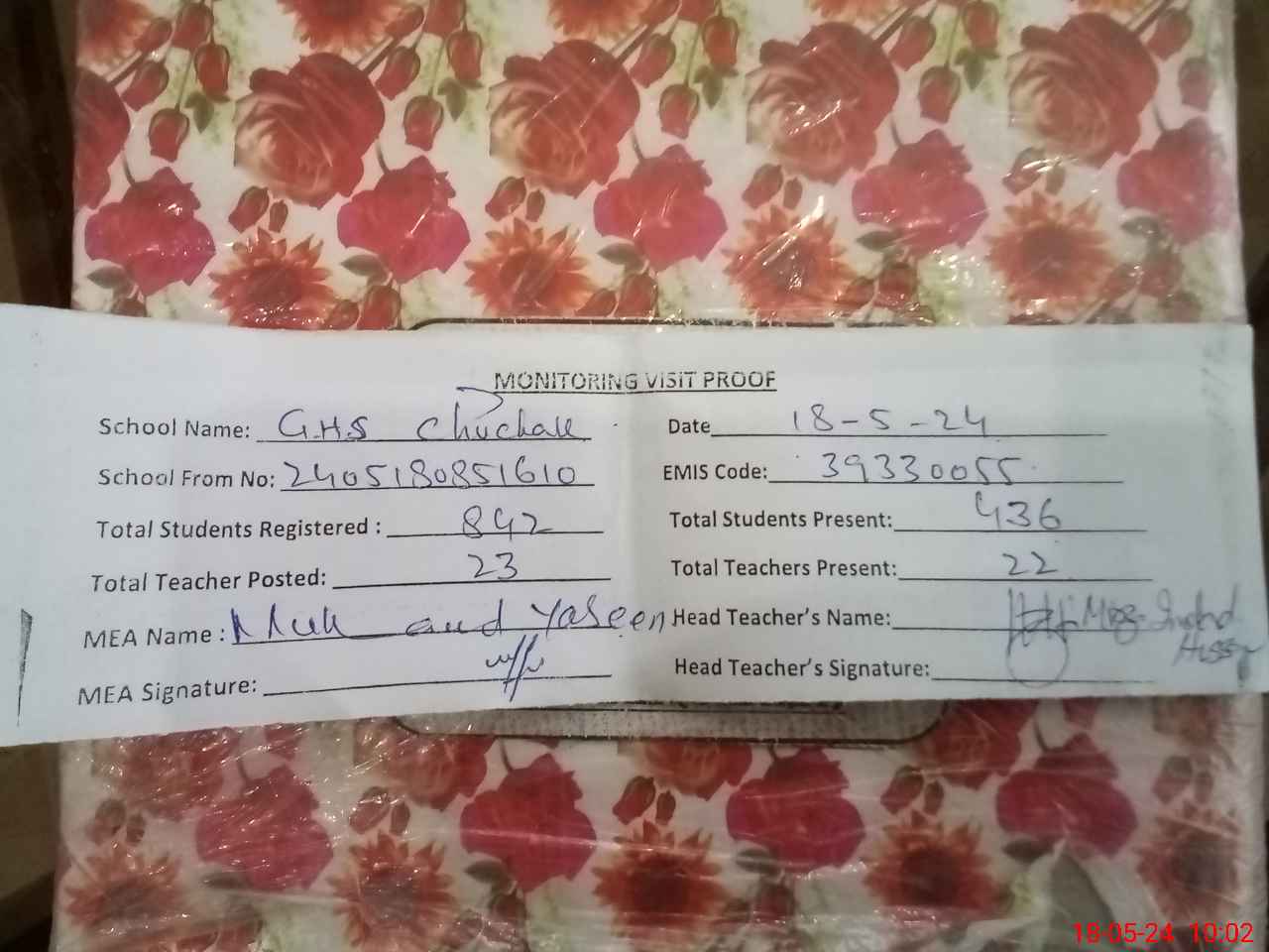 | Attendance Register | Head Teacher | MEA with School | Visit Proof |