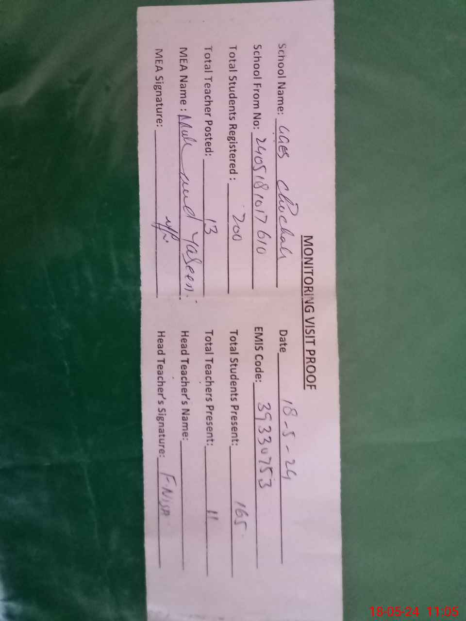 | Attendance Register | Head Teacher | MEA with School | Visit Proof |