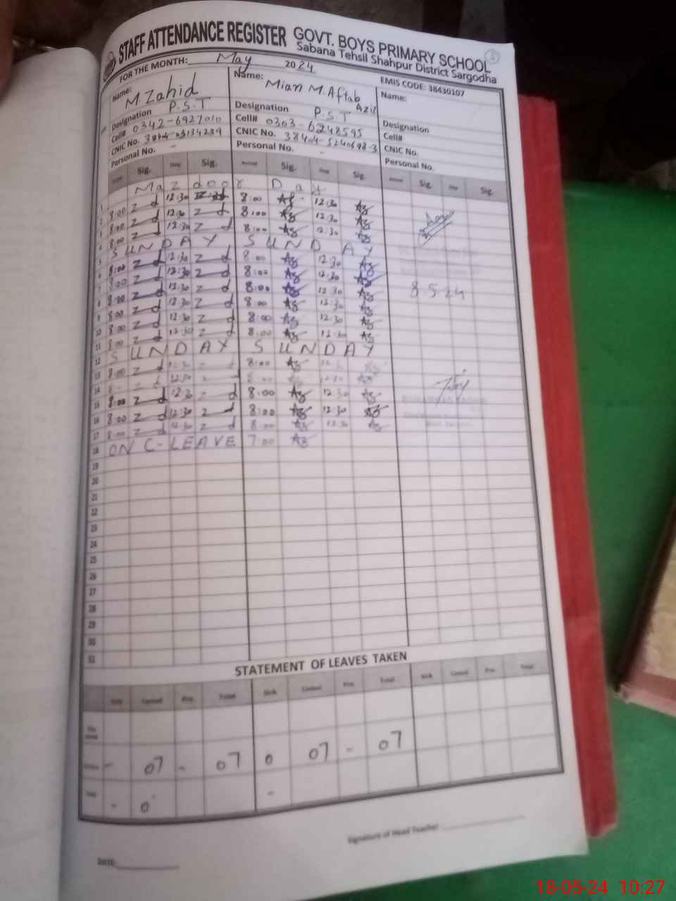 | Name: Af**** Az**** Designation: (School Headmaster's/Headmistress's) PST Phone/Cell Number: 03**** |
