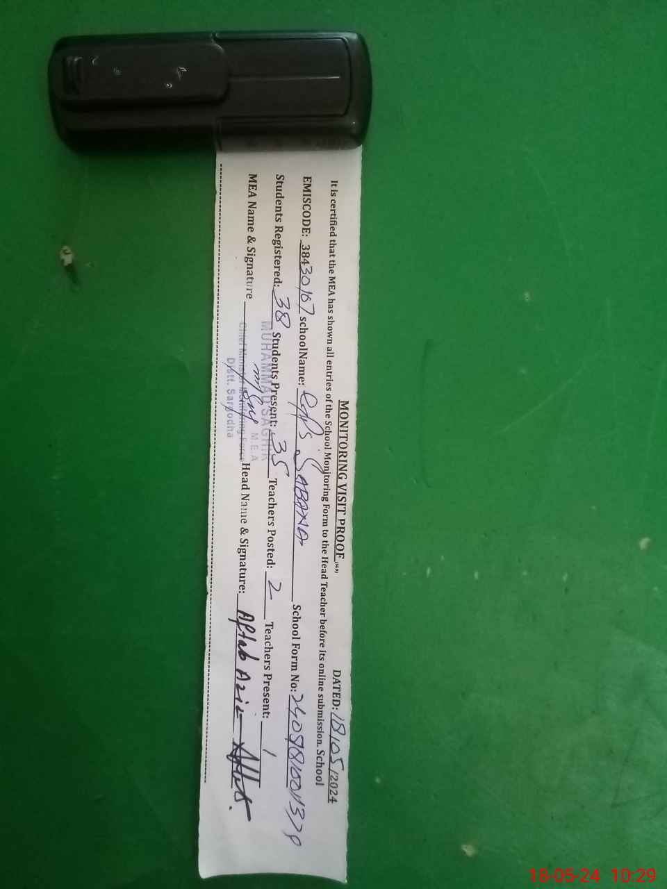 | Attendance Register | Head Teacher | MEA with School | Visit Proof |