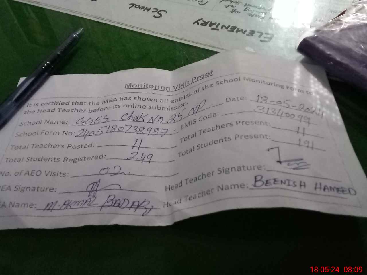 | Attendance Register | Head Teacher | MEA with School | Visit Proof |