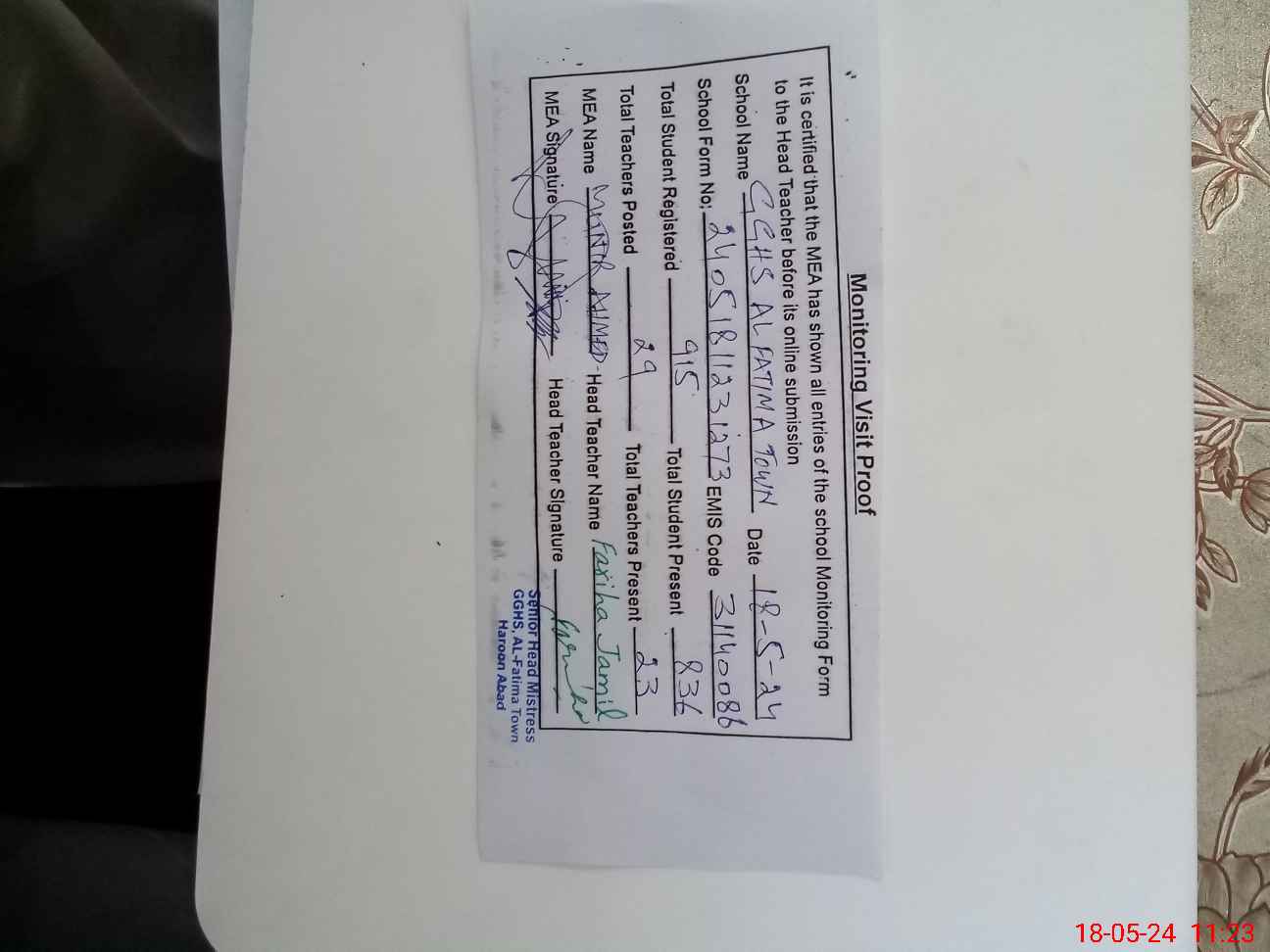 | EMIS Code: 31140086 | Name of School: GGHS AL-FATIMA TOWN | |||