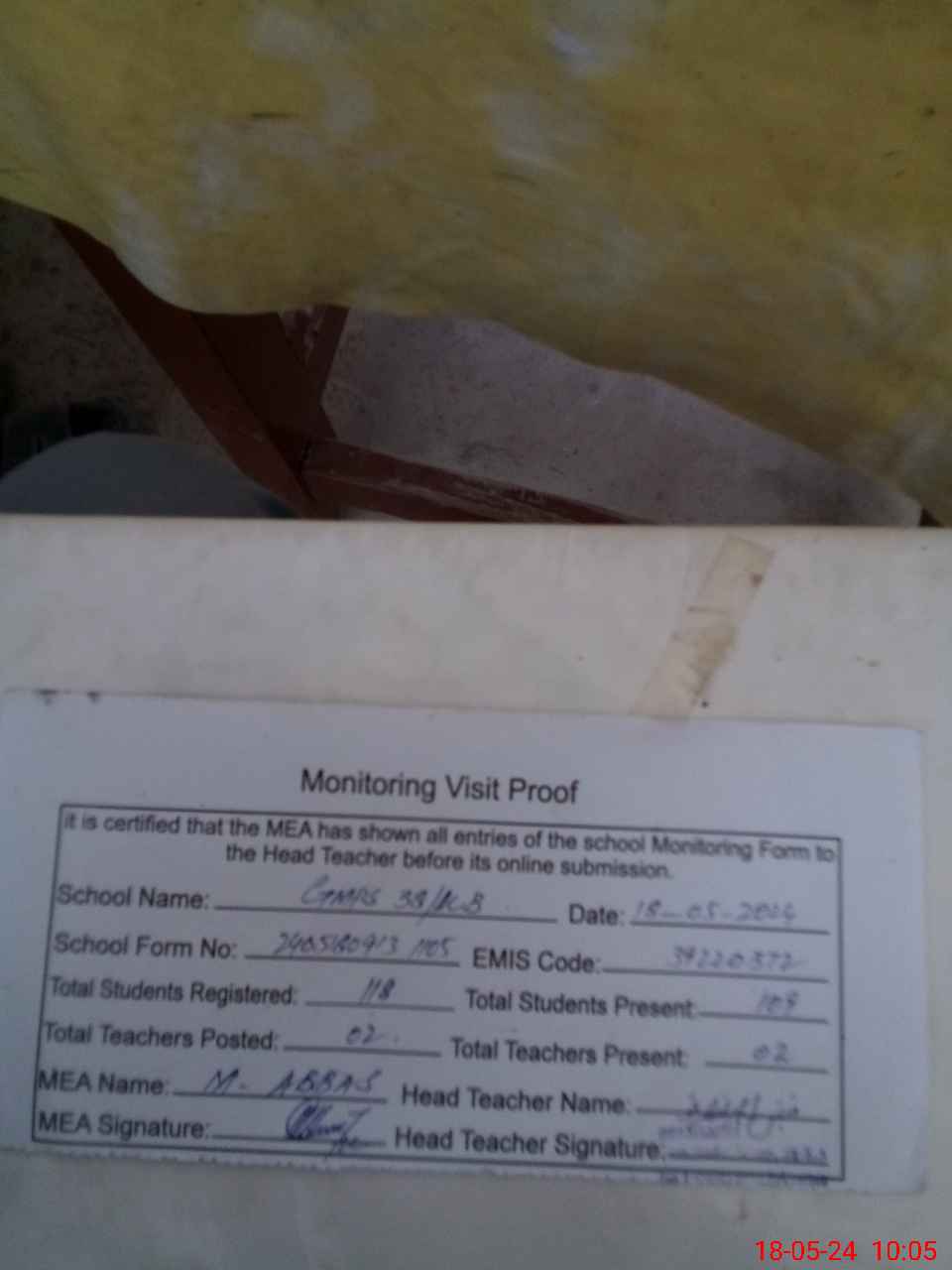 | Attendance Register | Head Teacher | MEA with School | Visit Proof |