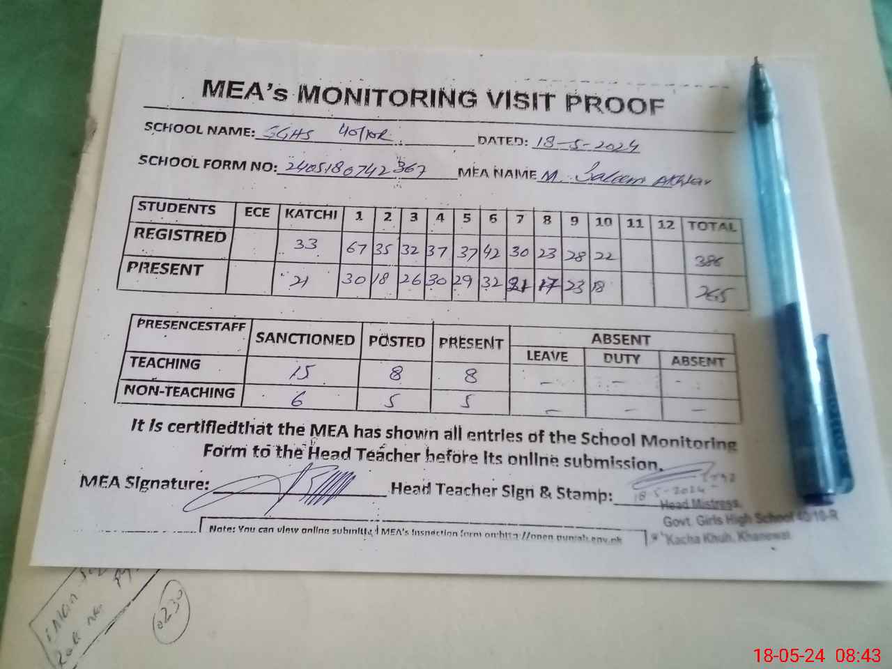 | Certified that this School was Inspected by the Undersigned MEA/DMO Today and the Information Stated Above is as Per Record. | |||||