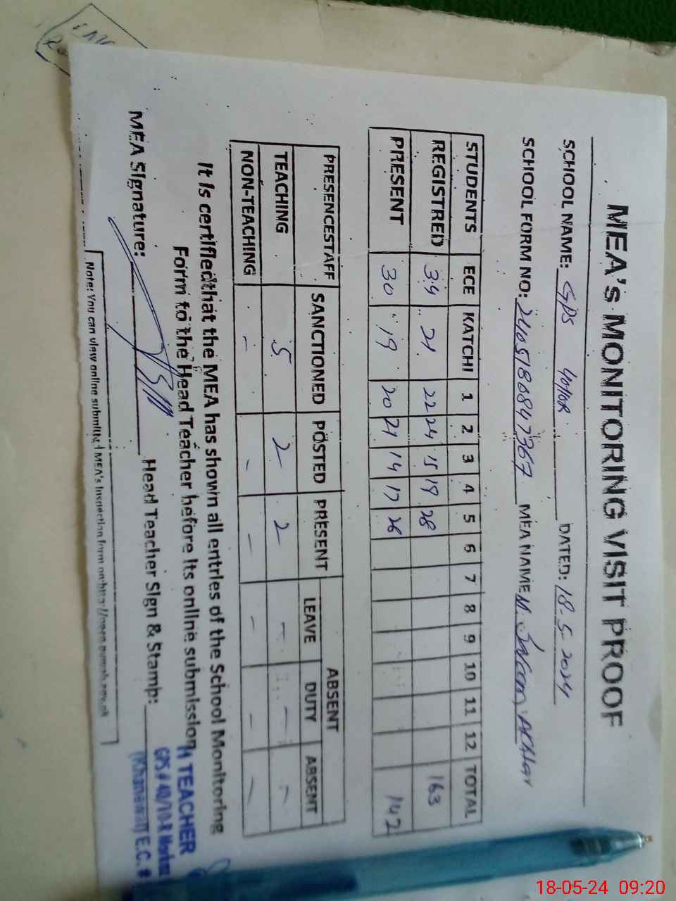 | Attendance Register | Head Teacher | MEA with School | Visit Proof |